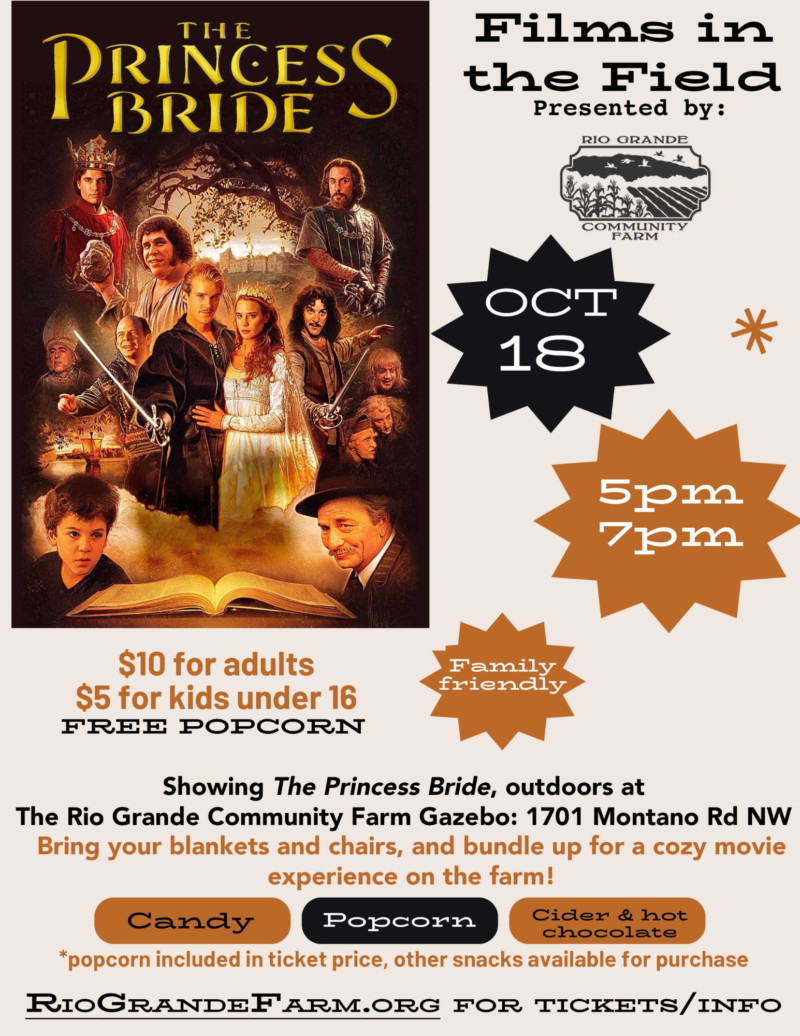 *UPDATE: We will only be showing the film at 5pm & 7pm* "As you wish..." Join us at Rio Grande Community Farm for a cozy evening (or afternoon!) under the...